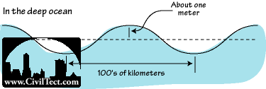 در آبهای عمیق سونامی ها زیاد بزرگ نبوده و خطر آفرین نیستند. ارتفاع موجها در چنین سونامی های بسیار کم و در حدود 1 متر است اما همین امواج وقتی به سواحل میرسند با توجه به متمرکز شدن نیروی موج در عمق کمتر, طول موجها افزایش یافته و میتوانند بسیار خطرناک باشند.