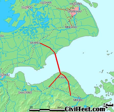ساخته شده بر روی خلیج هانگزو در چین, این پل طولانی ترین پل دنیا با بیش از 35,673 کیلومتر است. در این پل 6 لین برای عبور اتومبیلها در نظر گرفته شده است. در زیر نقشه این پل را مشاهده میکنید: